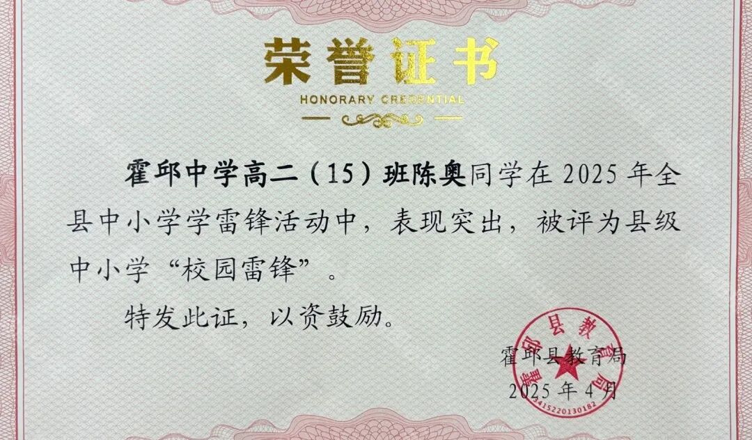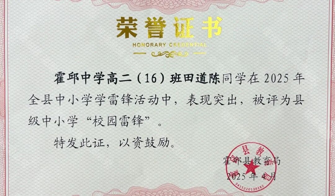 近日,县教育局开展的中小学“学雷锋”暨“校园雷锋”评选活动结果揭晓,我校高二(4)班付德雲、高二(15)班陈奥、高二(16)班田道陈三位同学凭借突出的志愿服务精神和模范事迹,荣获县级“校园雷锋”荣誉称号。
